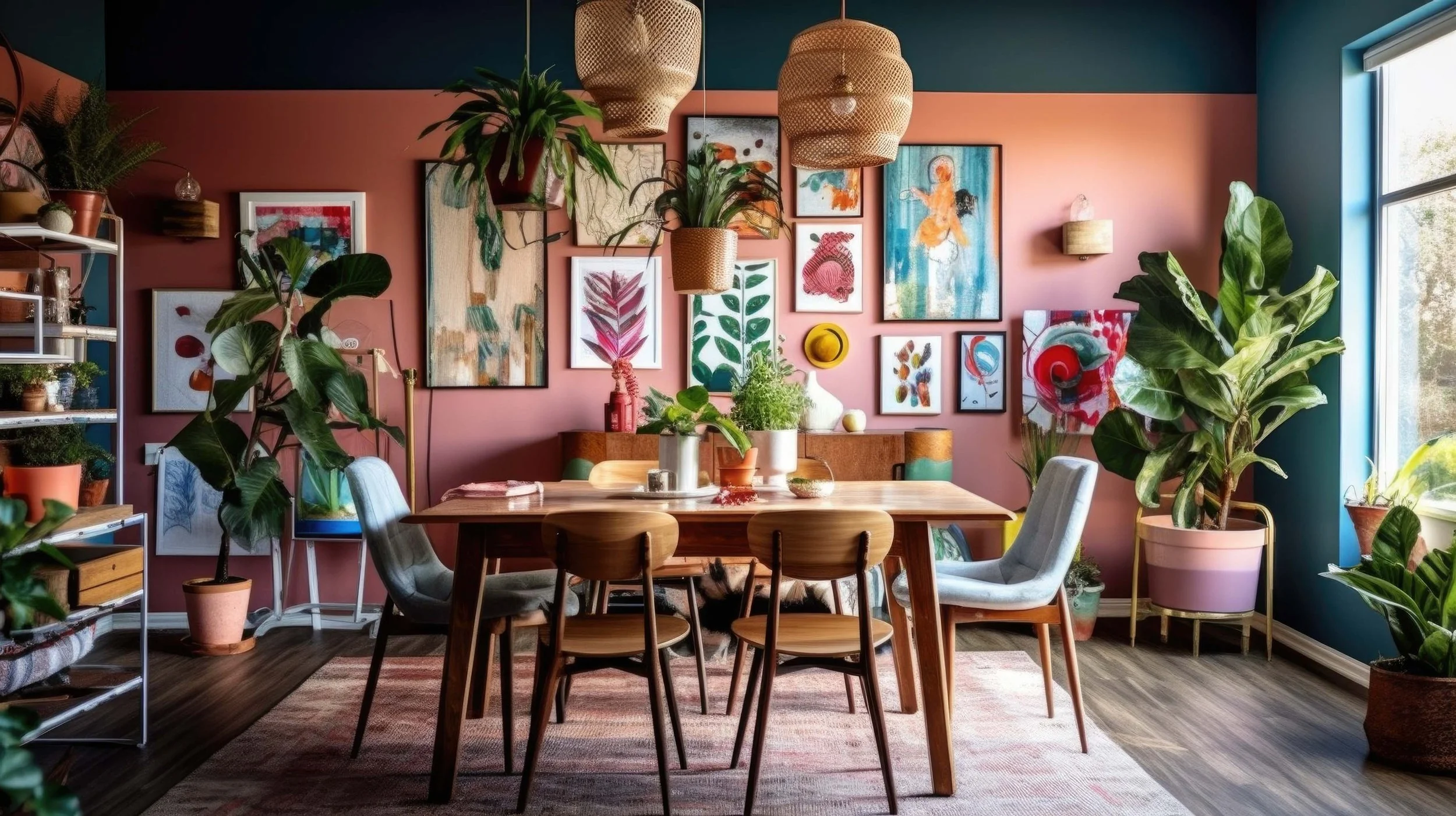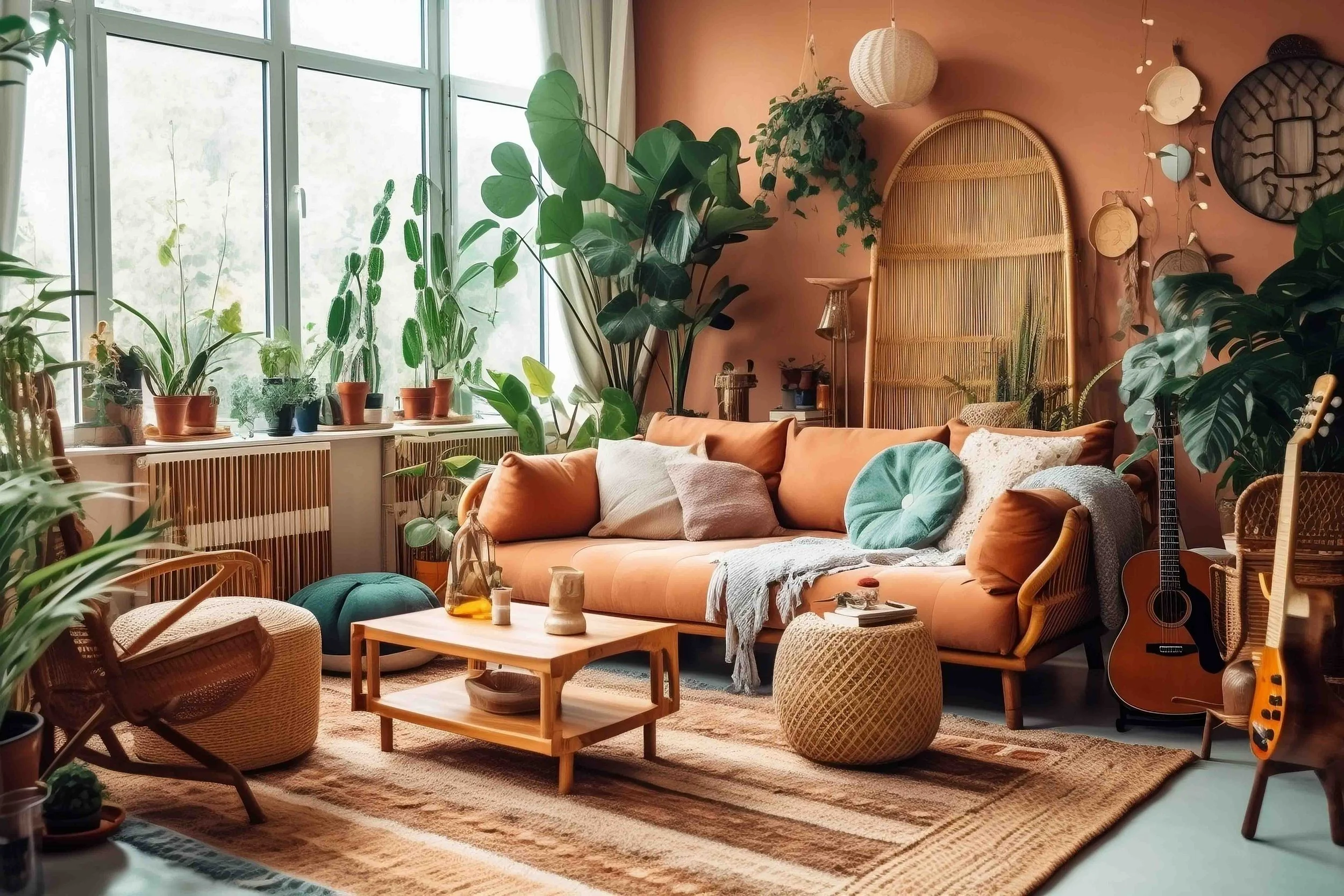 Natural materials, such as rattan, jute, and reclaimed wood, blend seamlessly with a mix of vintage and artisanal furniture, creating a warm and inviting ambiance. Textiles and greenery play a pivotal role, with an abundance of layered rugs, vibrant throws, and playful cushions that add a touch of nomadic flair, layered with plants and nods to nature.